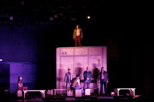 Scenografija Zorane Petrov je monumentalna u svojoj jednostavnosti: ogromna kutija dominira scenom, okružena klupama, mala kamion-igračka unosi groteskni, gotovo detinjasti ton, dok kutija sama funkcioniše kao oltar, prostor introspektivne meditacije i spomenik koji ne vidimo, ali osećamo. Isaković se penje na kutiju, stapajući se sa spomenikom — metaforički pokušaj da bude istovremeno živ i odjek mitske memorije. Na kraju, bronzani spomenik „plače“, spajajući simboliku početnog krsta, uz prisustvo svetla kao umornog božanstva, sa iskupljenjem junaka i sveta.