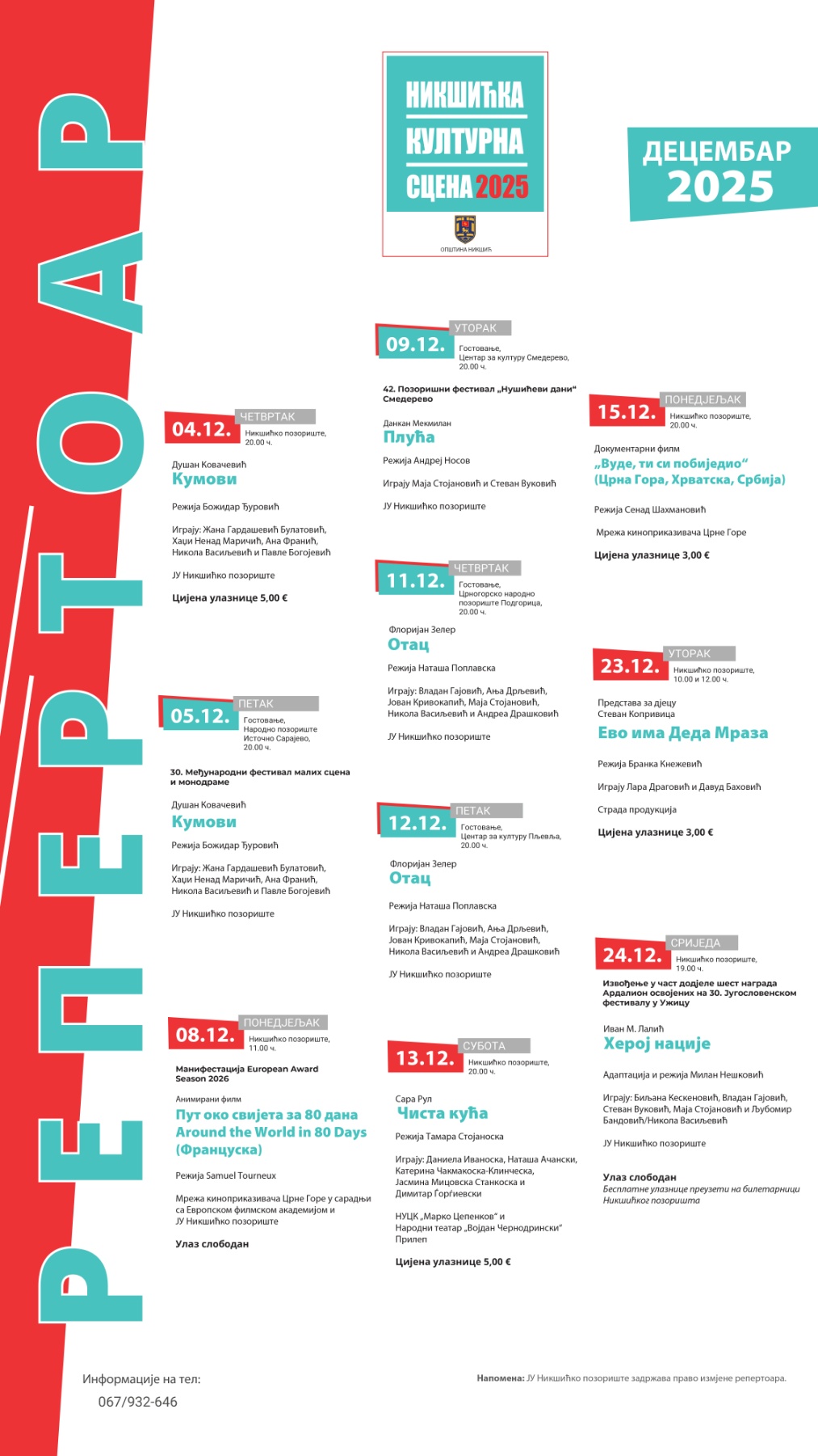 U decembarskom repertoaru, tri predstave iz produkcije Nikšićkog pozorišta gostovaće na prestižnim pozorišnim smotrama u zemlji i regionu. Već u četvrtak, 4. decembra na Večernjoj sceni matičnog pozorišta sa početkom u 20 sati, biće izvedena…