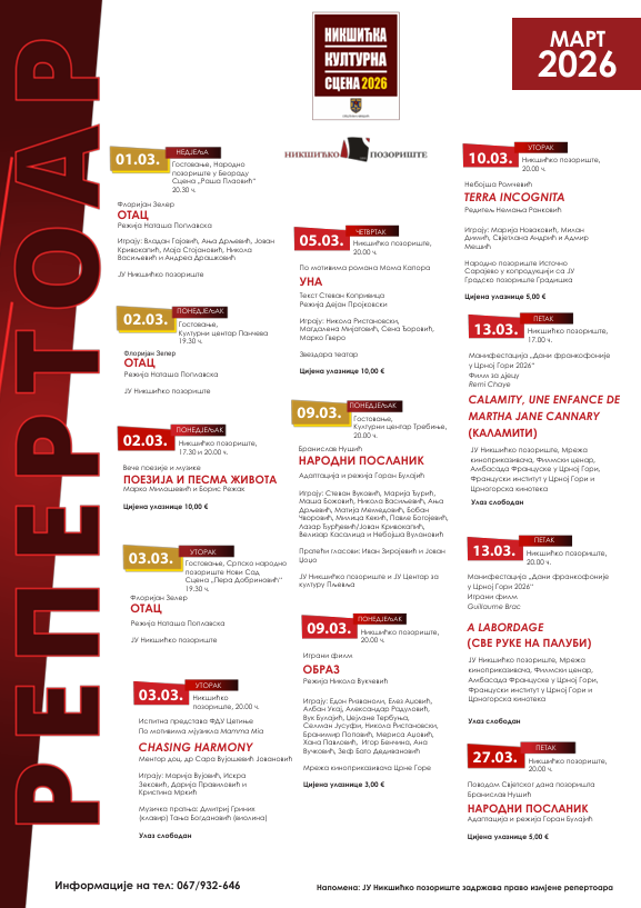 Nikšićko pozorište sa dramom Otac iz najnovije produkcije (premijera 3. oktobar 2025) 1. 2. i 3. marta gosuje u Beogradu, Pančevu i Novom Sadu. Prvo izvođenje je u nedjelju na SceniRaša Plaović, beogradskog Narodnog pozorišta,…